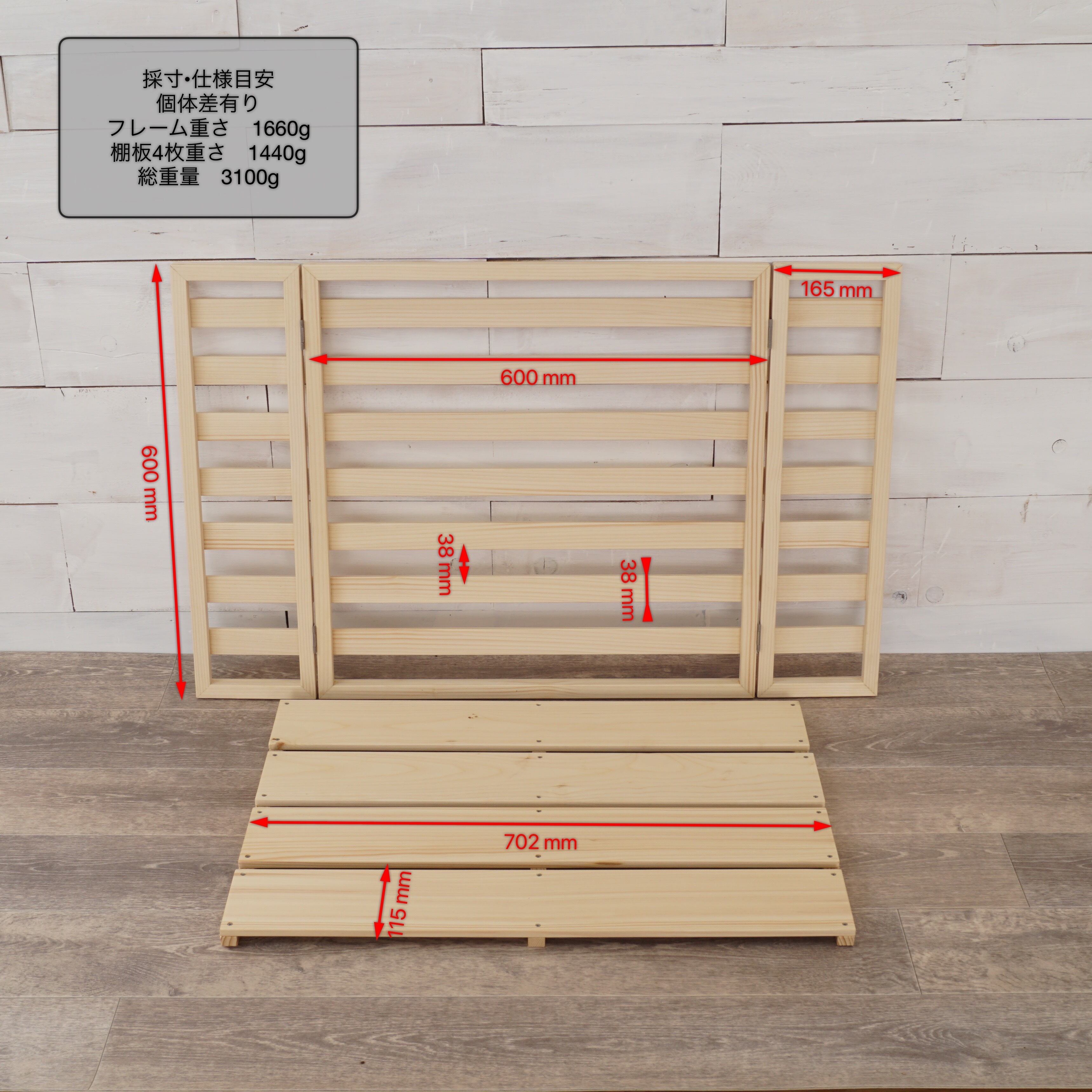 高さは約60センチでフレームはスノコになっているのでお好きな高さ・段数で棚板をセッティング出来ます。