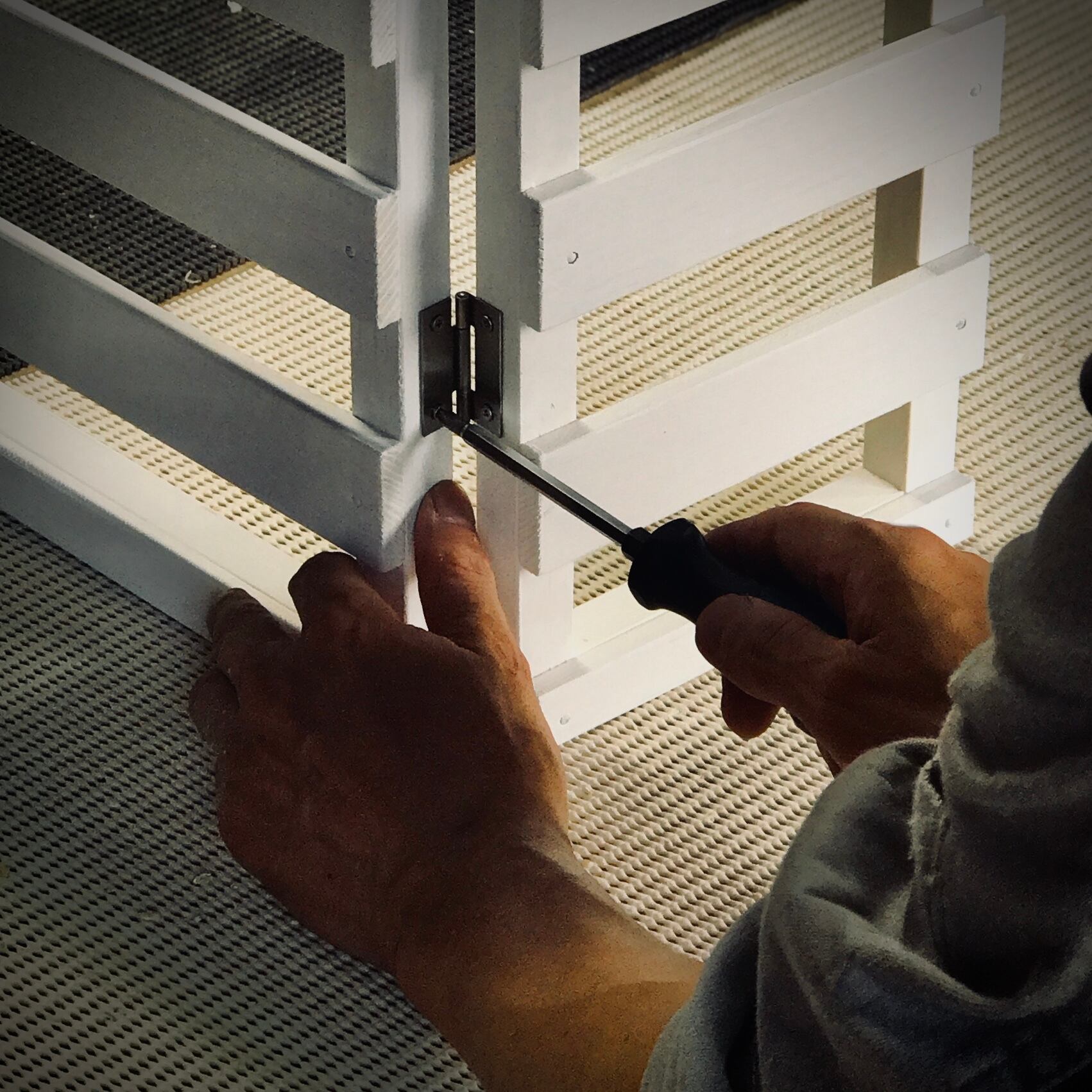 蝶番はステンレス製でネジはあえて少し緩めてあり、がたつきが有る事によって設置時のフィット率を高くしてあります。