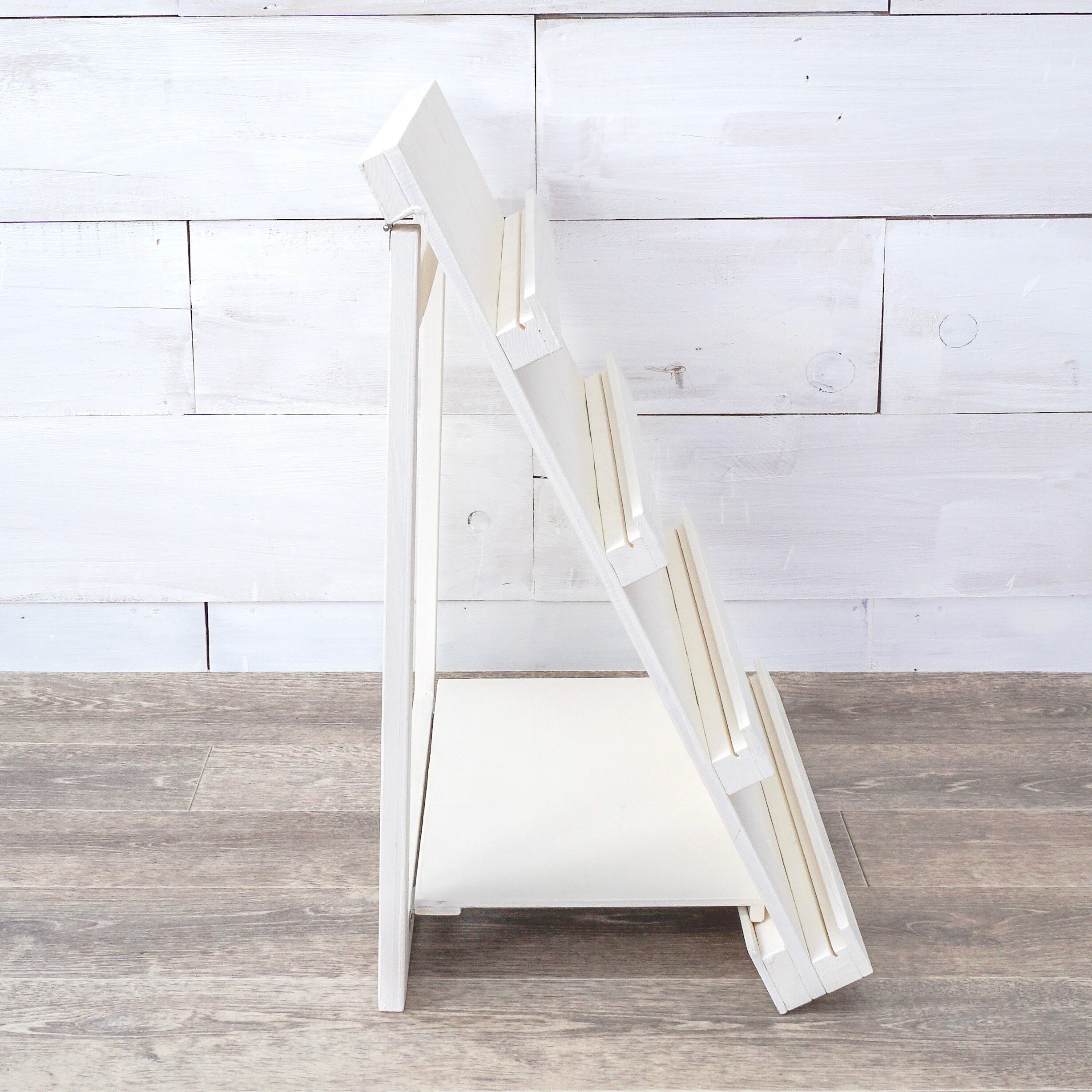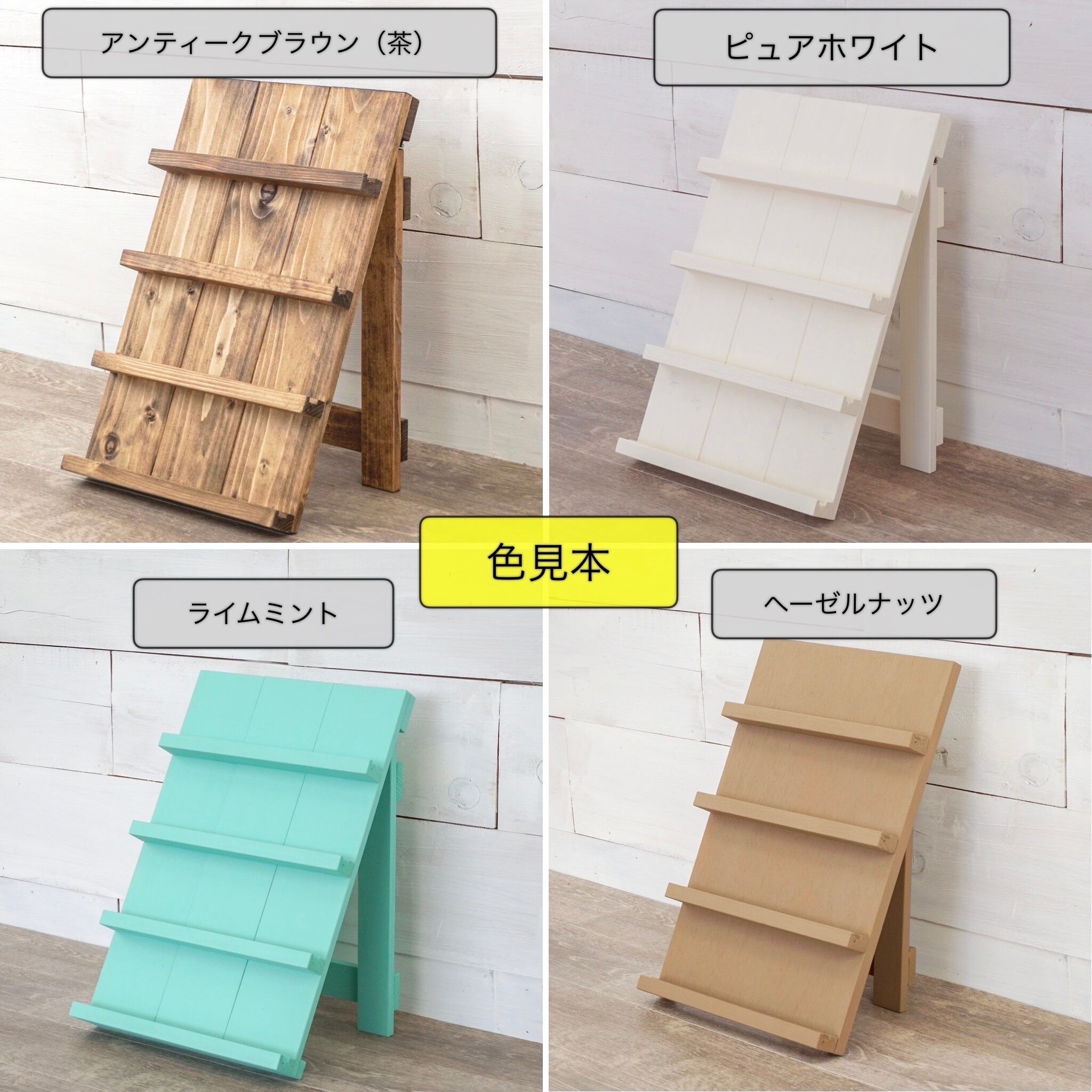 そんな事を叶える一品で柔らかい手触りが特徴の北海道産パイン無垢板が主材の4段の折り畳み什器です。