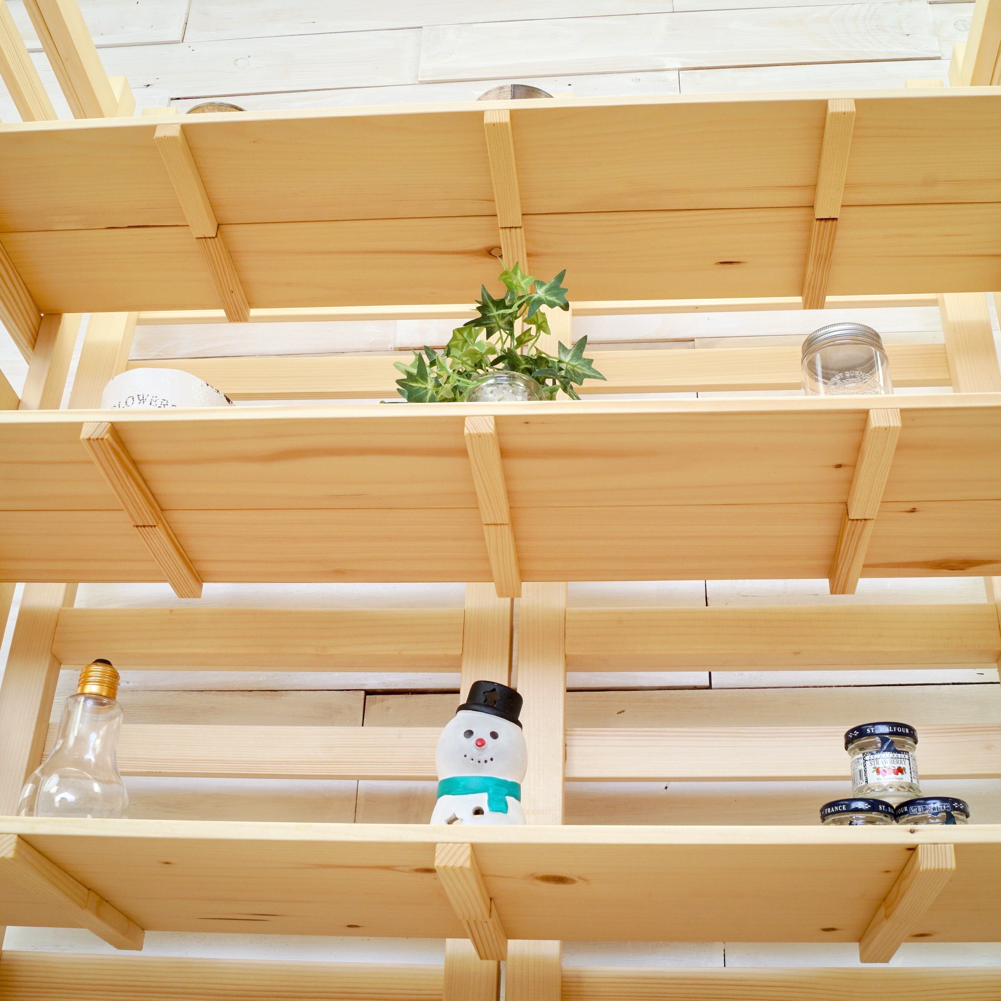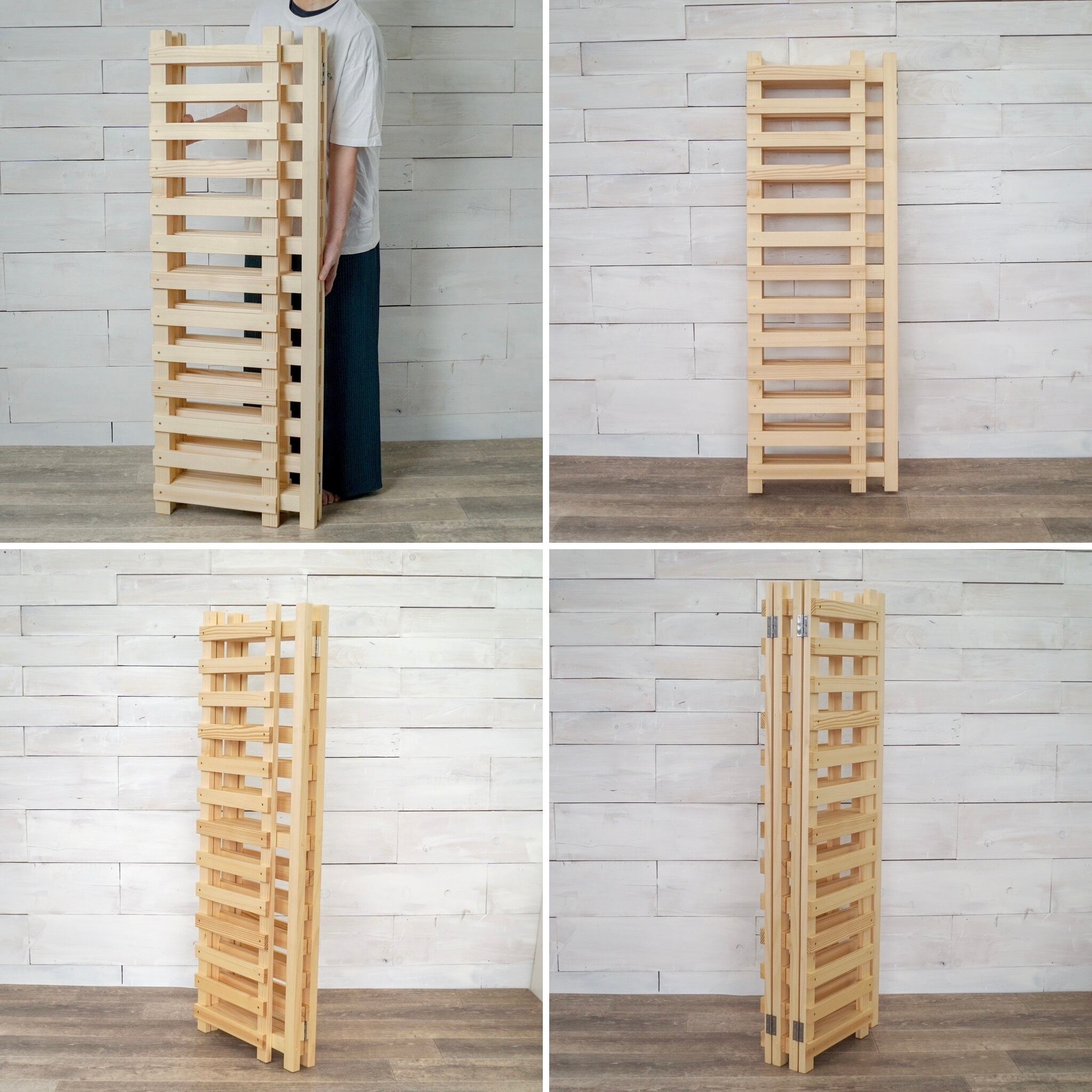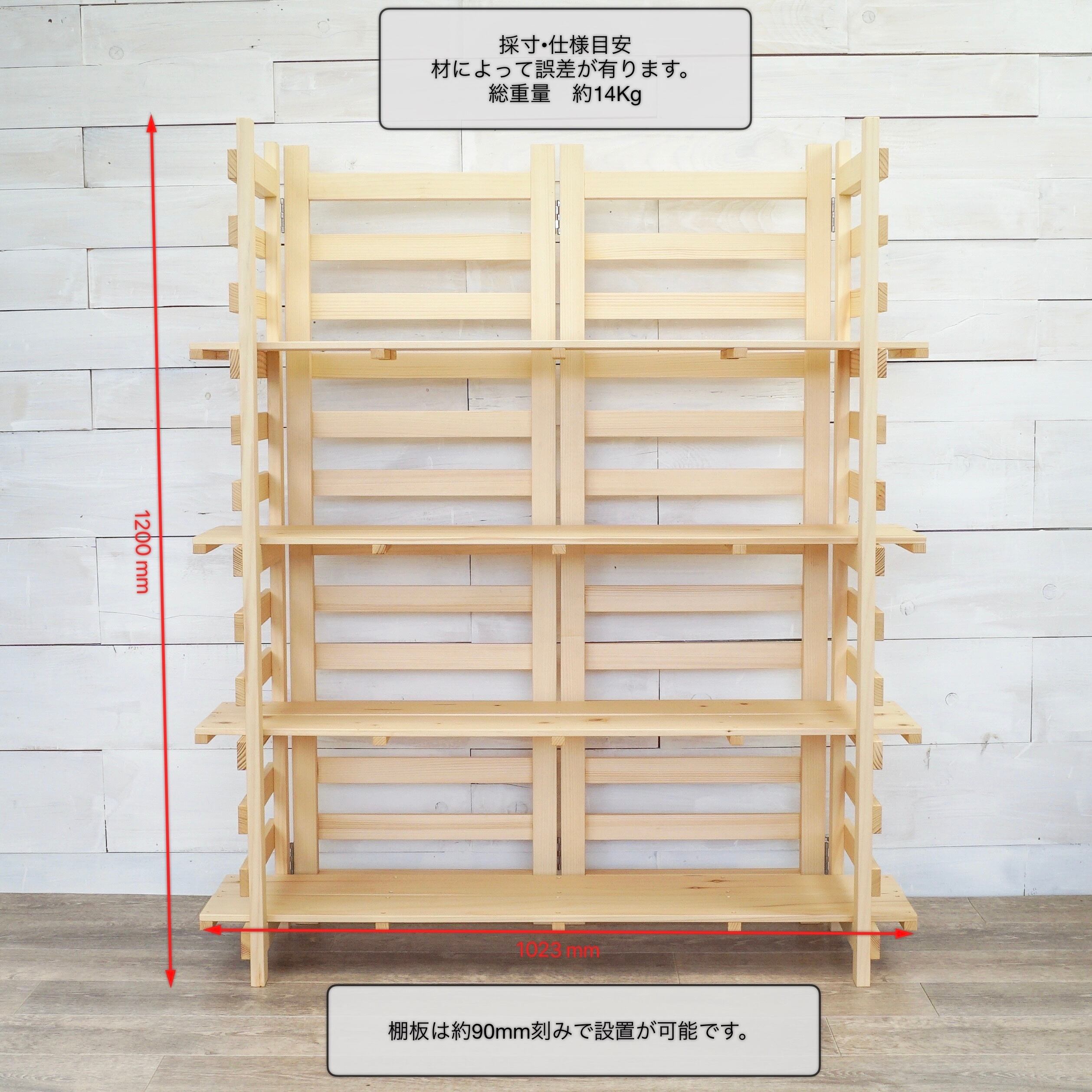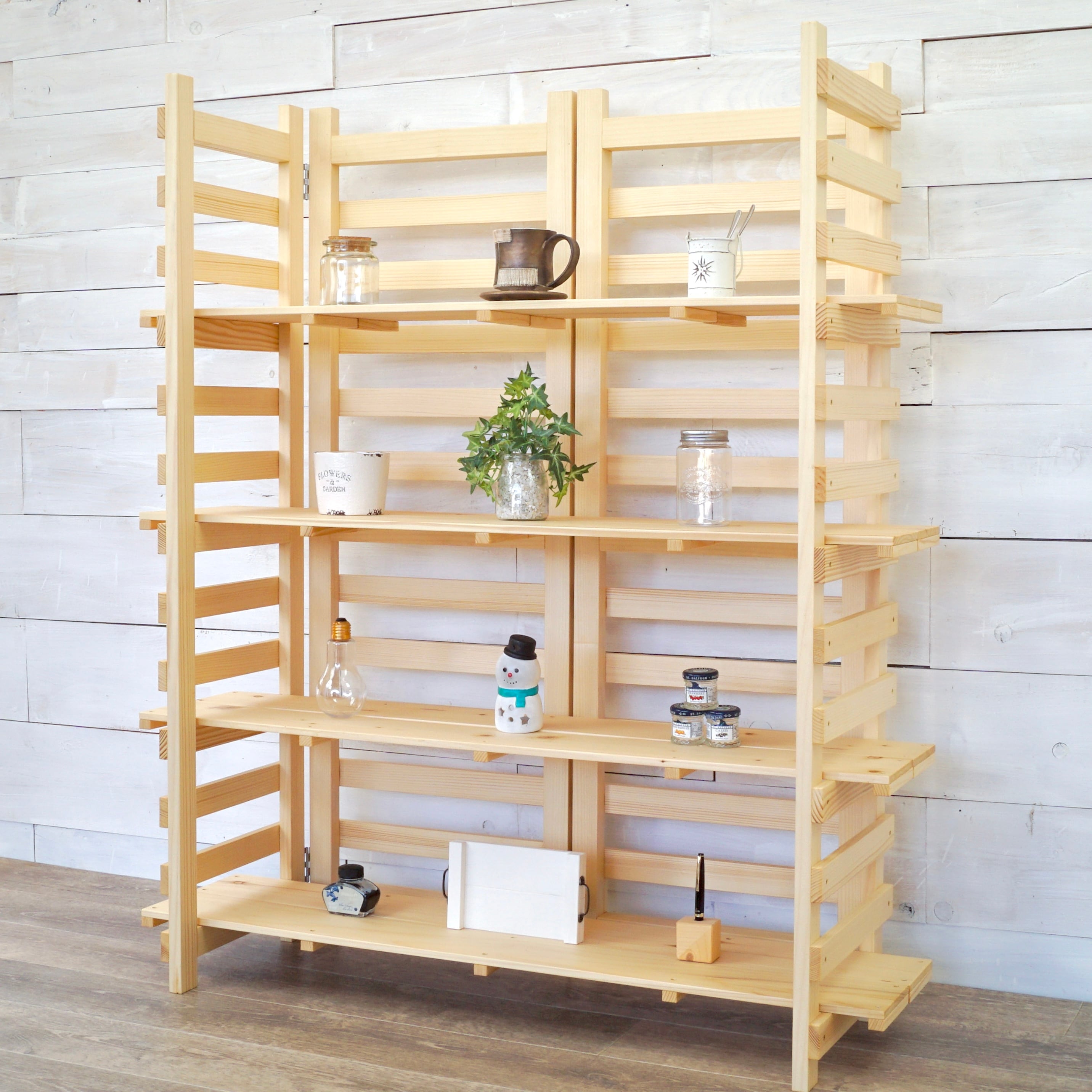 しなやかで柔らかい手触りが特徴のパイン無垢が材料の高さ約120cmの「折り畳みシェルフ120」です。