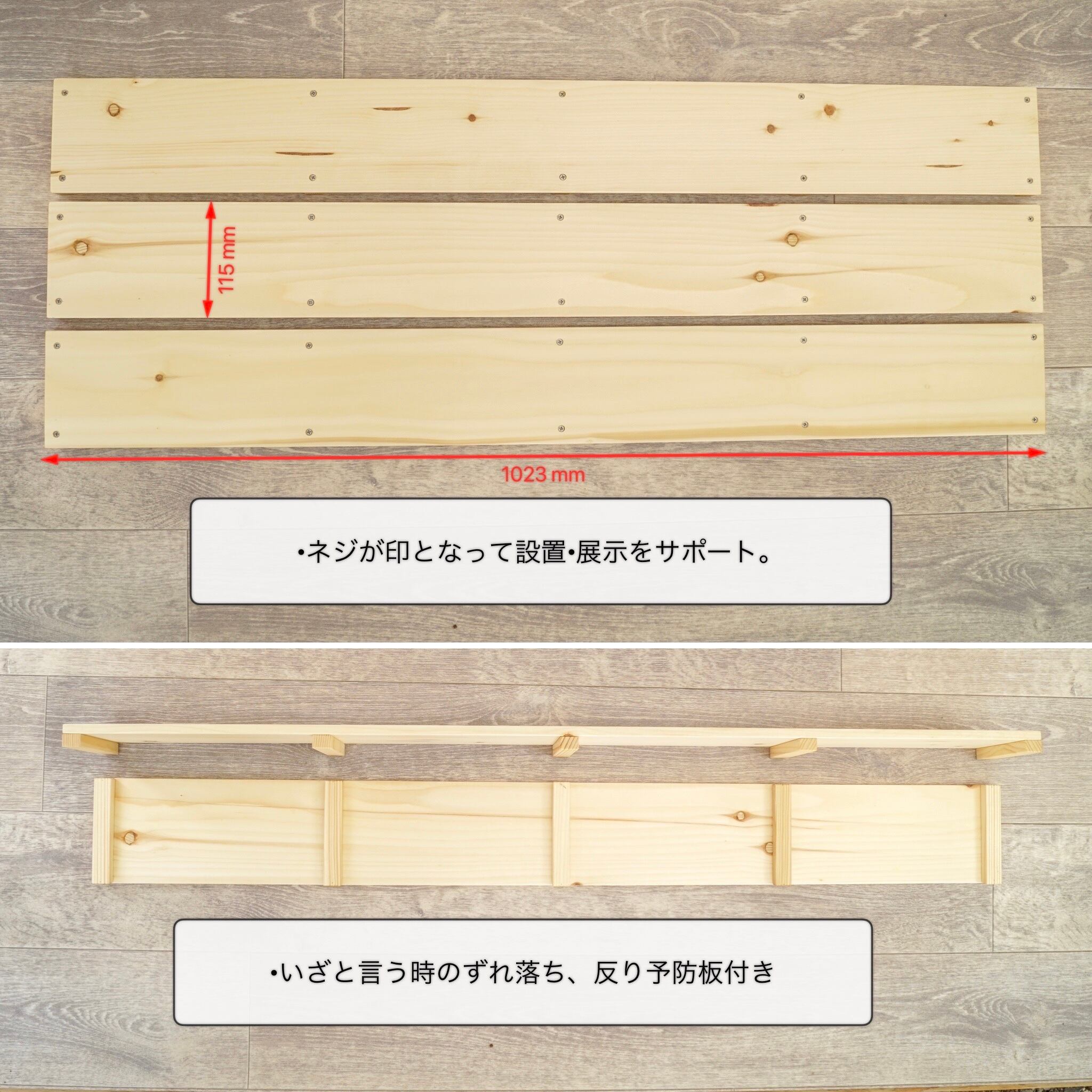 また棚板下部には「横滑りで外れる・反り」予防板が付いており、その固定ネジが印となって「展示・設置」をサポートします。